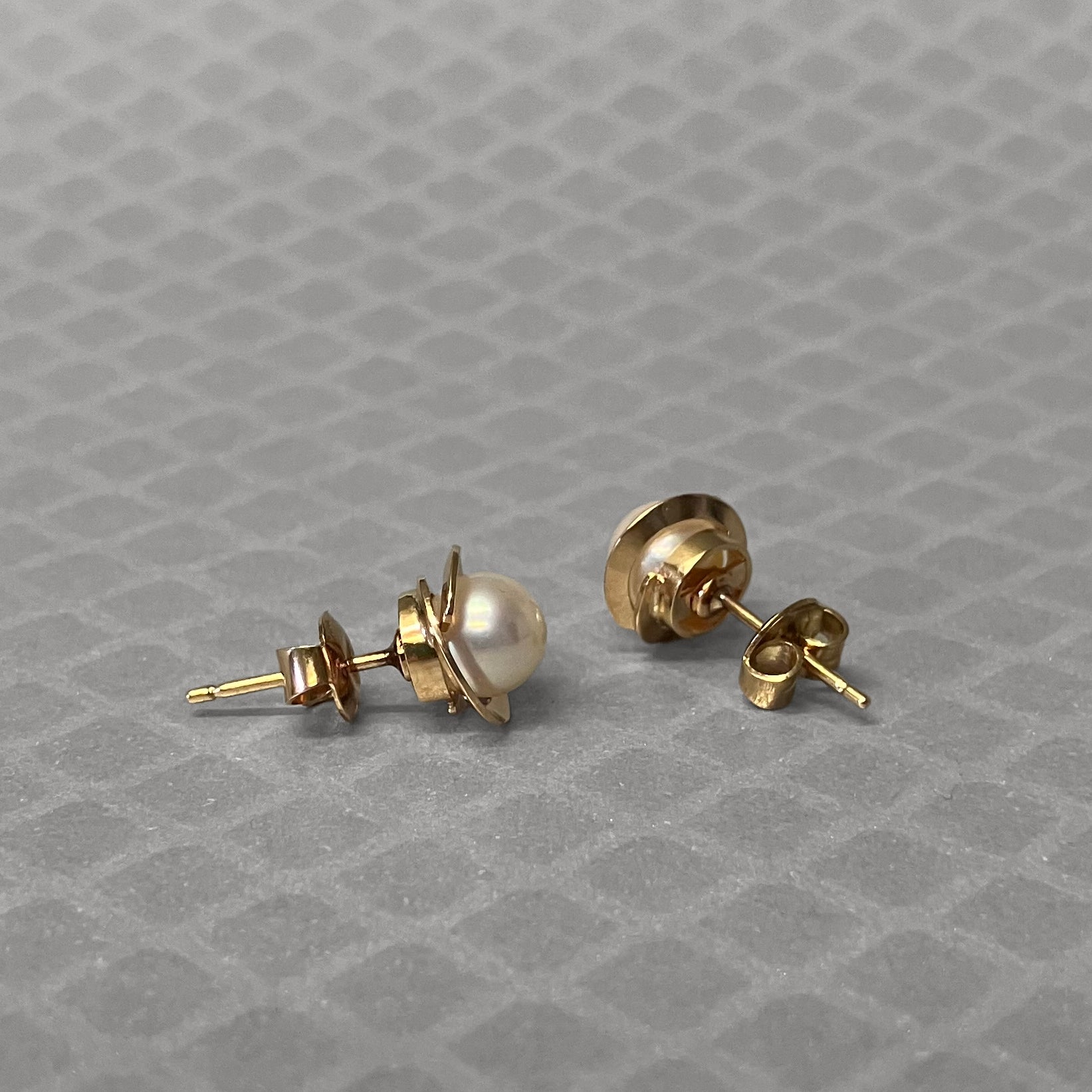 Pearl earrings are always in style! This pair of cultured pearl earrings are set in high polished yellow gold, which wraps all around them. Classic with a twist!