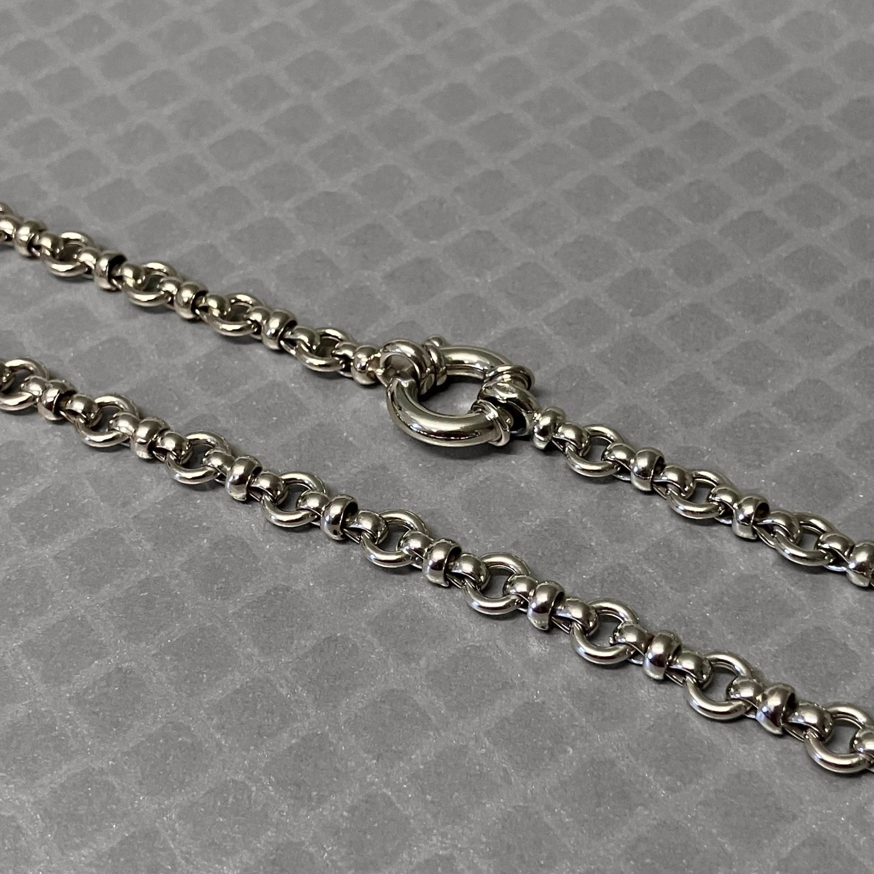 What a pretty circular link collar! It feels so good on. The oversized clasp is a fun design element, to be worn in the front or back!