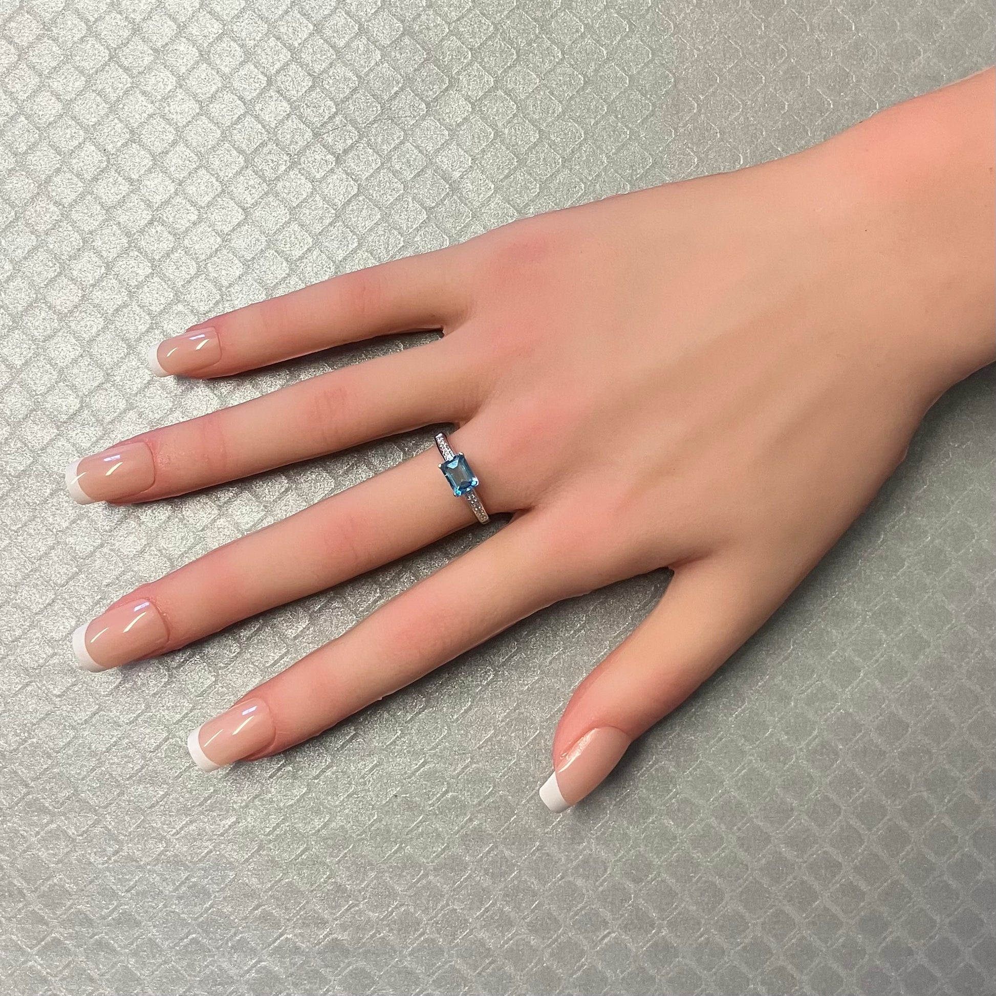 If you can't be at the beach, this blue topaz will remind you of sparkling Caribbean waters! Set horizontally with diamonds on each side, all in 14kt white gold.
