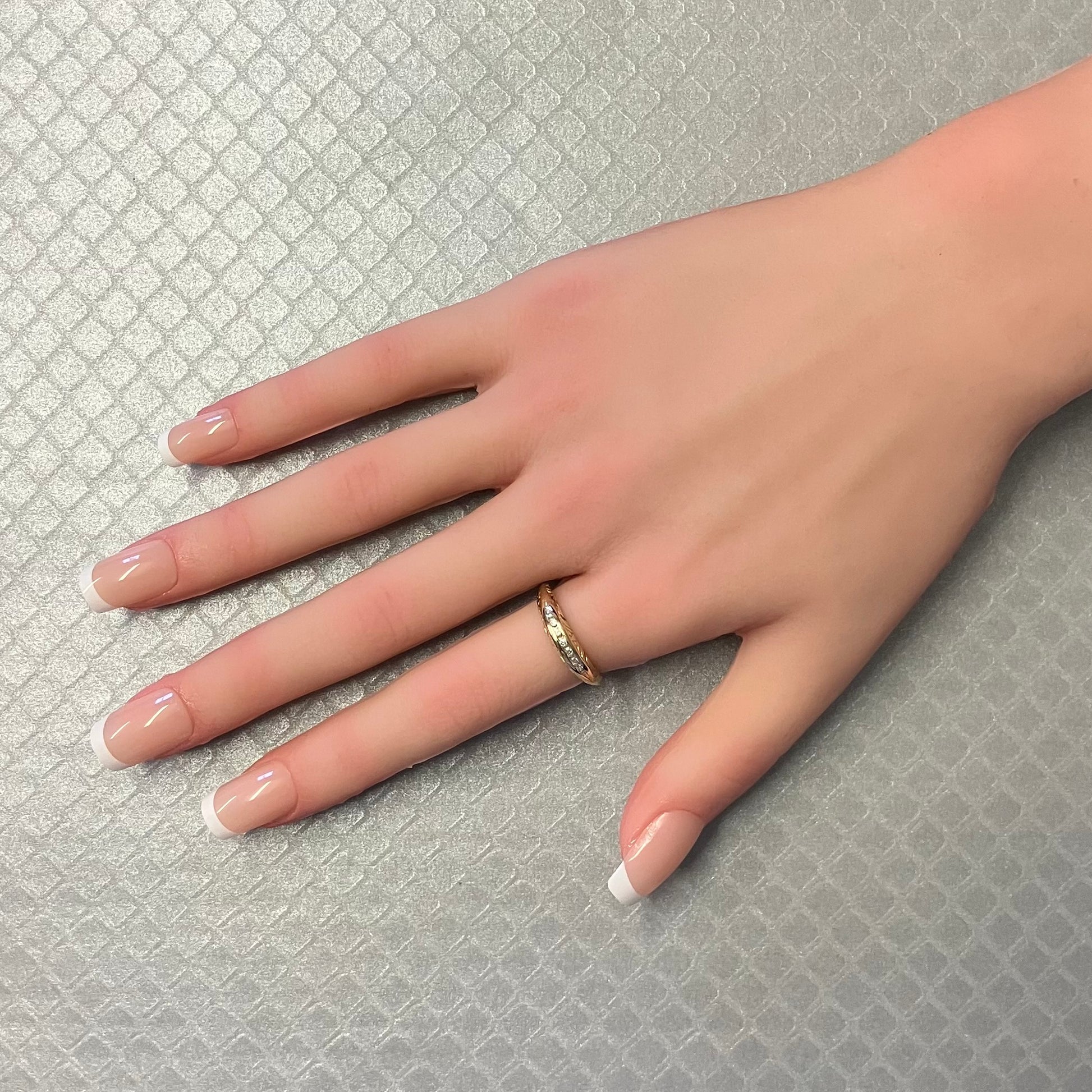 There are so many exquisite details to this contoured diamond band! Nine round diamonds are channel set across, with an open naturalistic design on each profile side. It shows beautifully against the warmth of yellow gold!