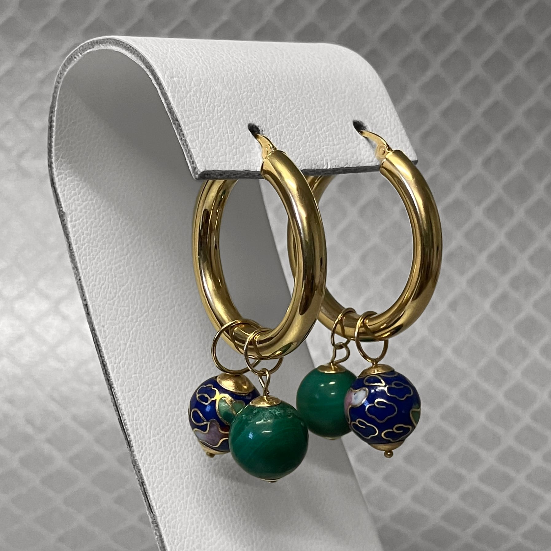 Who remembers these?? So popular in the 1990's! One inch in diameter, these hoops have two sets of interchangeable beads-dark blue cloisonne and green malachite that slide on and off easily. So many looks from a pair of hoop earrings!