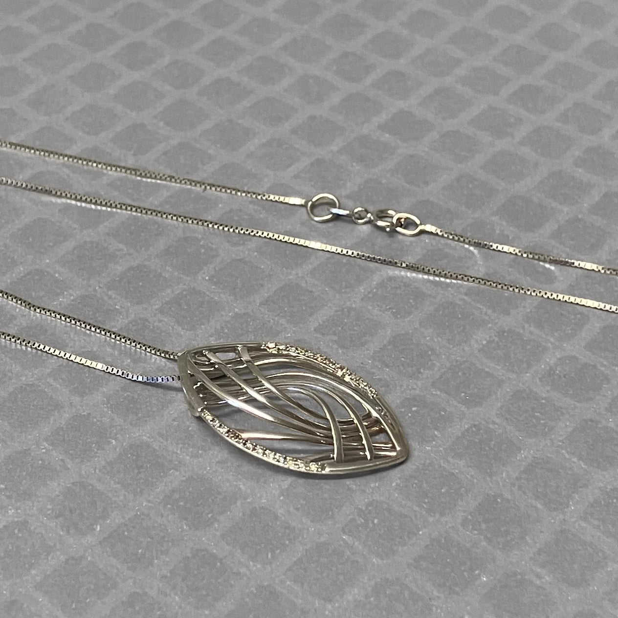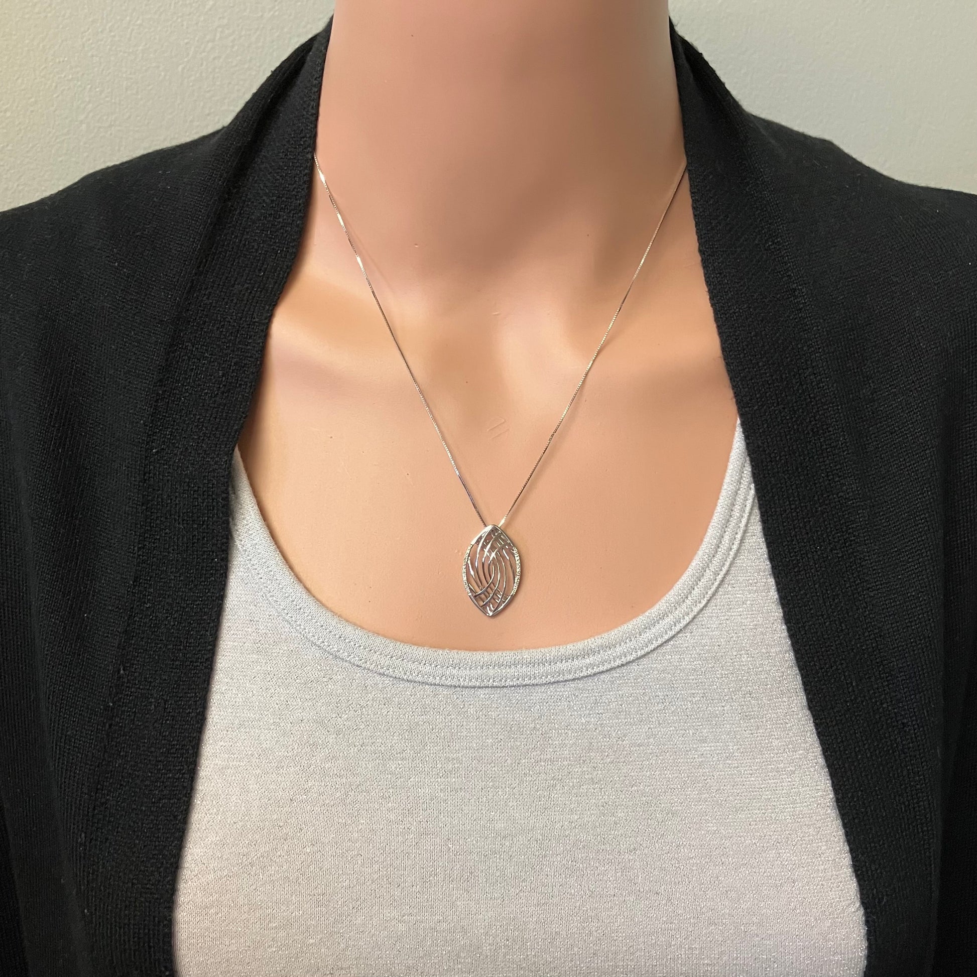 A distinctive pendant with so much design interest! Duplicating shapes fill this 18kt white gold marquise, edged with diamonds for a glittering effect. It hangs from an 18" 14kt white gold box chain.