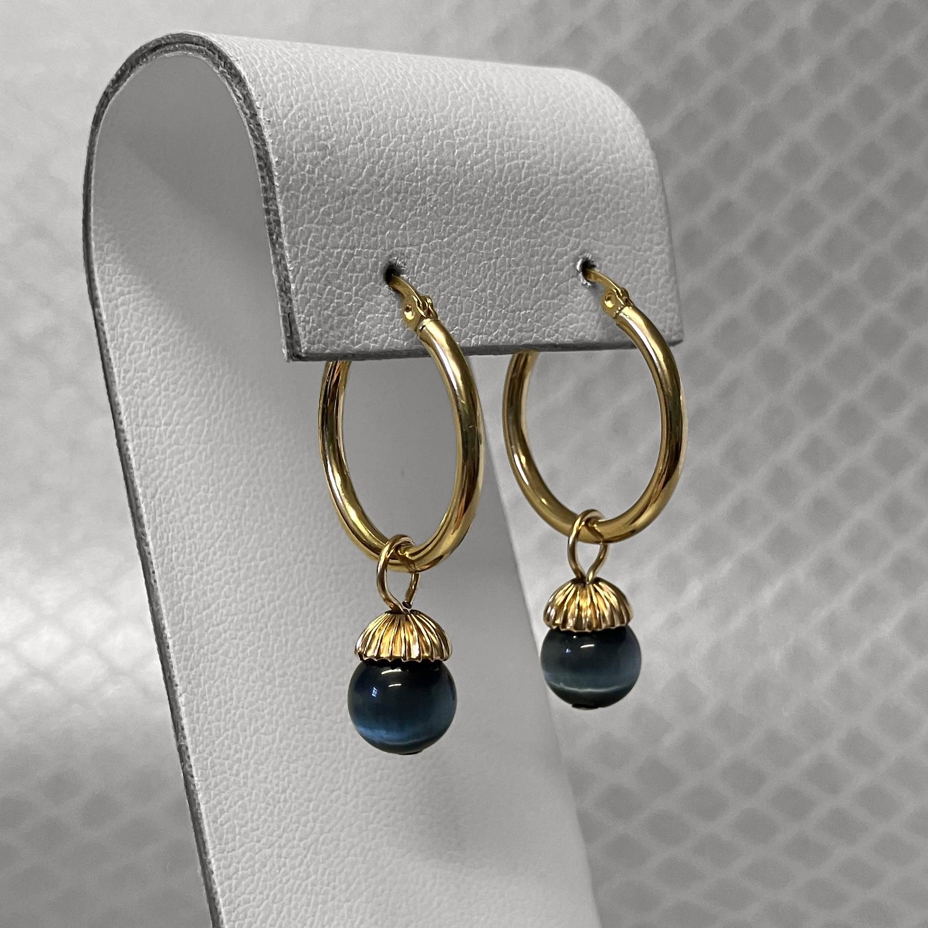 Such a great collection! 14kt yellow gold hoops (about 3/4" in diameter) can be worn alone or with any of these drops! Onyx circles, dyed grey tigers eye, as well as pear shaped citrines and amethysts are all included.